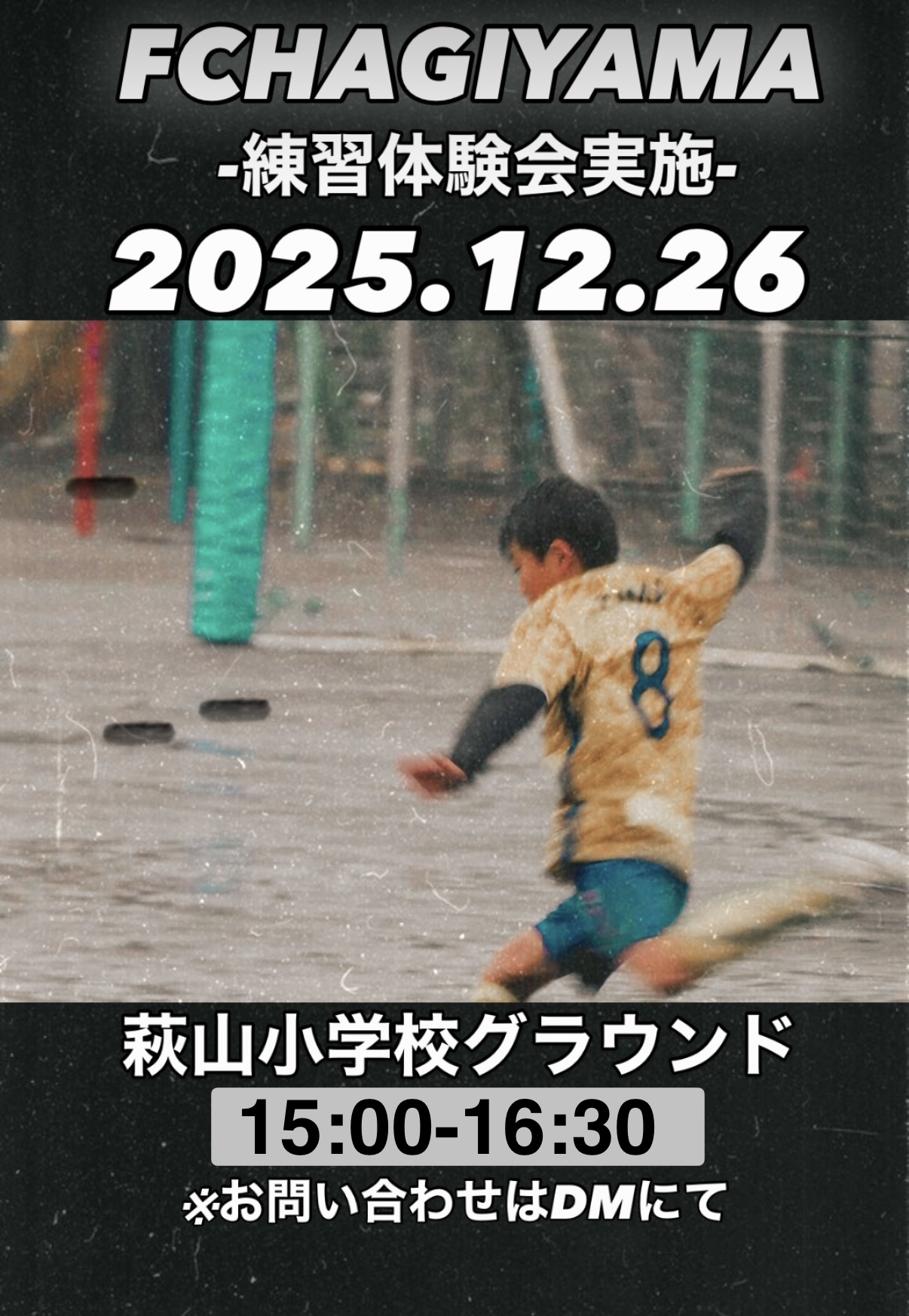 FC萩山では、随時新入部員の募集をしておりますが、12月26日(金)にキンダー〜5年生を対象に無料練習体験会を開催します!興味がある方はぜひ参加してください!